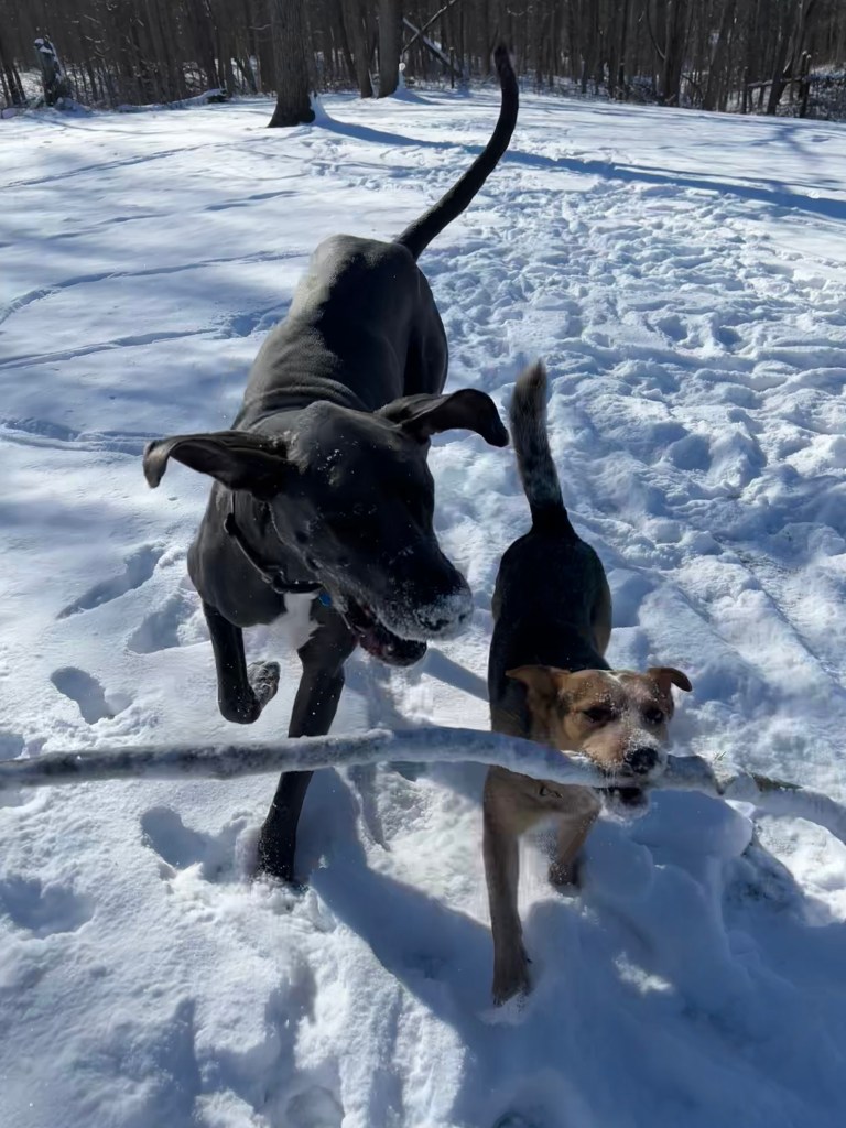 Happy Pictures Posted on February 20, 2024 by lisamackinder “To friendship every burden is light.” – Aesop. Timber and Griffin returning the stick together. Share this: Click to share on X (Opens in new window) X Click to share on Facebook (Opens in new window) Facebook Like Loading... Related